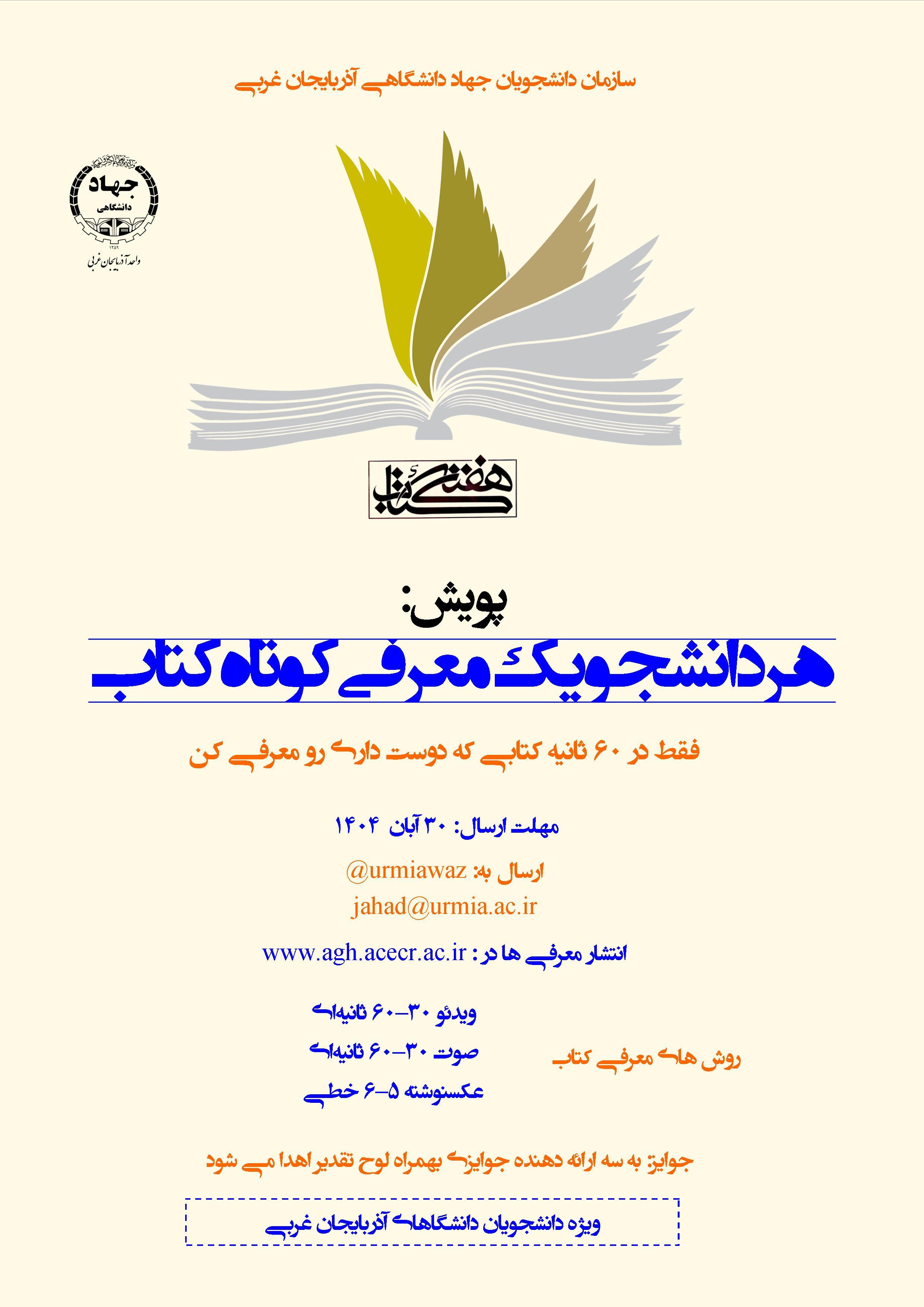 دانشجویان دانشگاه های آذربایجان غربی علاقمند به شرکت در این رویداد می توانند نسبت به معرفی ۳۰ تا ۶۰ ثانیهای کتاب پیشنهادی با ذکر نام کتاب، نویسنده و دلیل پیشنهاد اقدام کنند و محتوای تولیدی خود را تا 30 آبان به ایمیل Jahad@gmail.com ارسال نمایند.