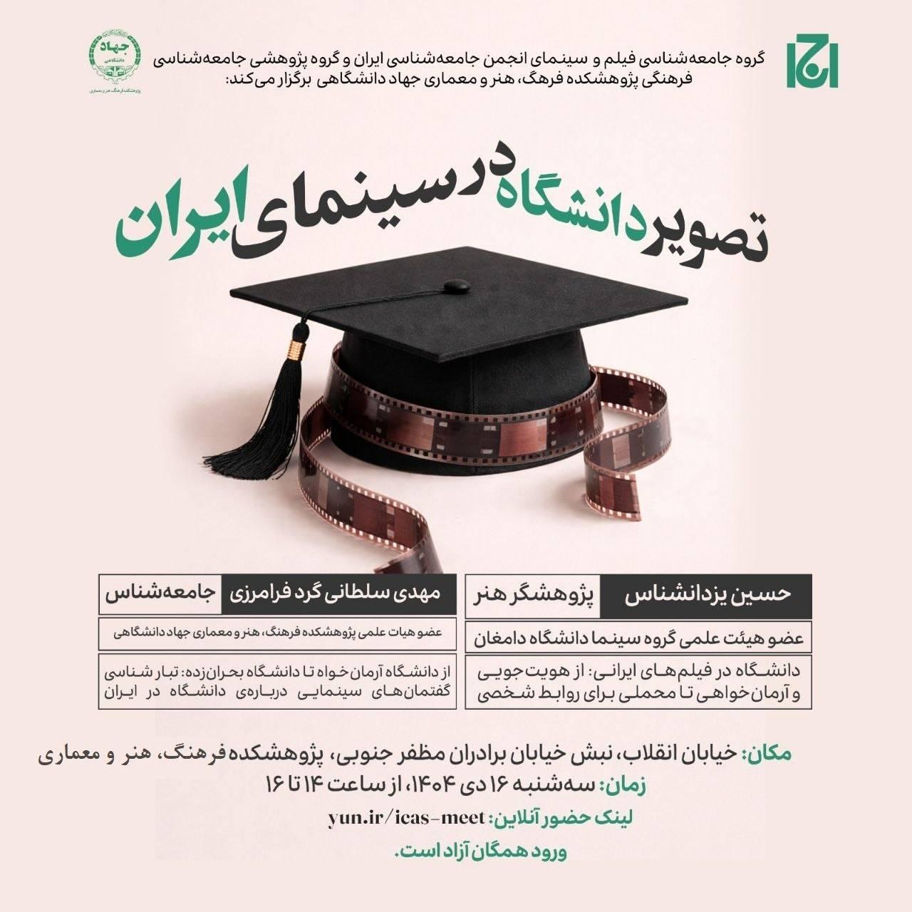 نشست «تصویر دانشگاه در سینمای ایران» روز سه شنبه، 16 دی ماه از ساعت 14 تا 16 در سالن اندیشه پژوهشکده فرهنگ، هنر و معماری جهاد دانشگاهی برگزار میشود و ورود برای عموم علاقمندان آزاد است.